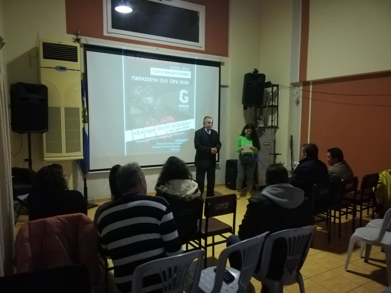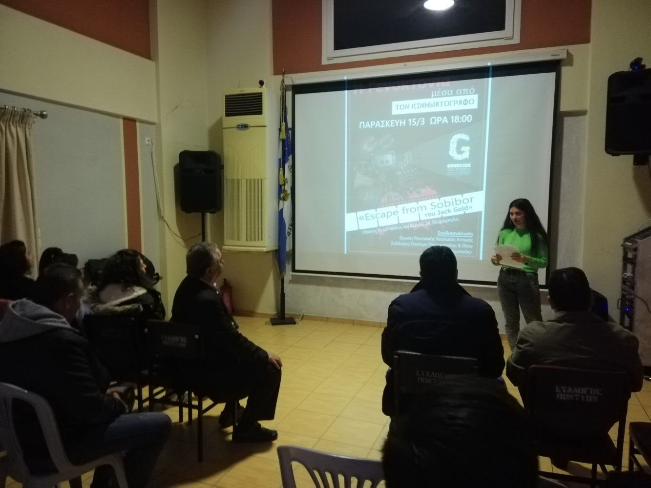 Την Παρασκευή 15 Μαρτίου 2019, και ώρα 18:00, η Ένωση Ποντιακής Νεολαίας Αττικής και ο Σύλλογος Ποντίων Πετρούπολης – Ιλίου, «Μανουήλ Κομνηνός», στην αίθουσα εκδηλώσεων του τελευταίου, πραγματοποίησαν προβολή της ταινίας «Escape from Sobibor».