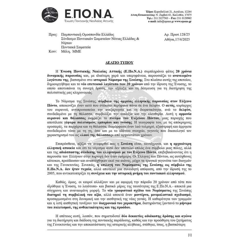 Παράλληλα, δημιουργήθηκε και το επετειακό λογότυπο των 20 χρόνων που σηματοδοτεί δύο δεκαετίες αδιάκοπης δράσης και αγώνα για τη διατήρηση και διάδοση της ποντιακής παράδοσης, καθώς και για την αποκατάσταση της ιστορικής αλήθειας και την Αναγνώριση της Γενοκτονίας των Ελλήνων του Πόντου.